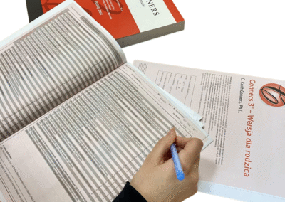 To kwestionariusz do diagnozy ADHD oraz zaburzeń współwystępujących (np. zachowania opozycyjno‑buntowniczego, zaburzeń emocjonalnych i trudności w funkcjach wykonawczych). Zbieram opinie od rodziców, nauczycieli i — w wersji samooceny — od dziecka. Pozwala to stworzyć profil funkcjonowania w domu, szkole i w relacjach społecznych.